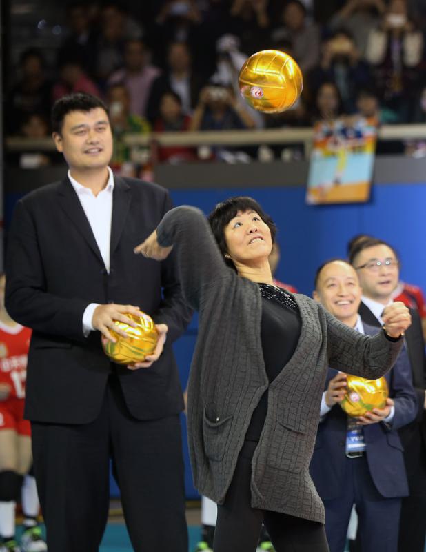 圖:郎平(前)早前出席女排聯賽揭幕戰開球禮時展露身手