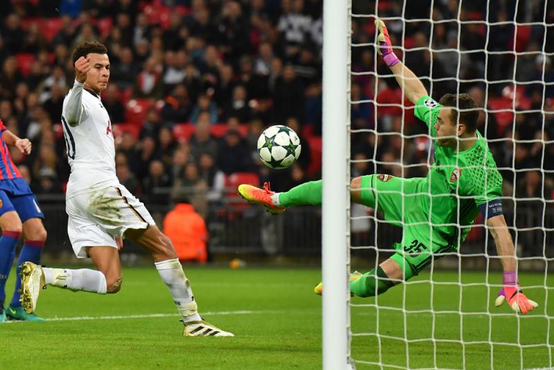圖:熱刺的迪利阿里(左)近門射入中央陸軍大門。他們本屆改以溫布萊球場作歐聯分組賽主場比賽,結果三仗錄一勝兩負出局收場,該隊將重返白鹿徑主場打歐霸杯的主場賽事\法新社