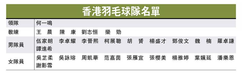 本屆出戰全運會的香港代表團陣容龐大,代表團成員多達248名運動員,以及102名工作人員和醫護人員共350人。除了備受注目的項目如單車、馬術及田徑外,港團尚有參加其餘18個項目,當中羽毛球及乒乓球就各以不同心態應戰,香港羽毛球隊派出多達25人的教練職球員陣容出戰,其中選手20名,為歷屆之冠。至於香港乒乓球隊則「貴精不貴多」僅派三名球員(連同教練共五人)上陣。港羽隊在男女子團體及五個單項皆能入圍全運正賽,出戰人數為歷屆之最,以老將「黑妹」葉姵延及「一哥」伍家朗帶領下,港羽隊將全力爭取獎牌。\大公報記者 梁潤森