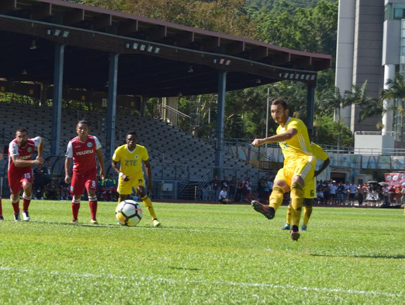 圖:香港飛馬的伊高(右)射入十二碼球\大公報記者何嘉軒攝