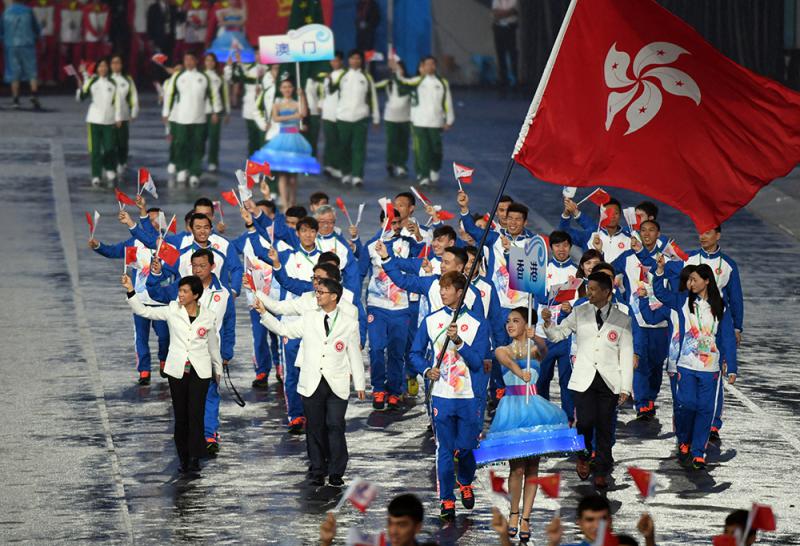 圖:持旗手張家朗帶領香港代表團入場\中新社