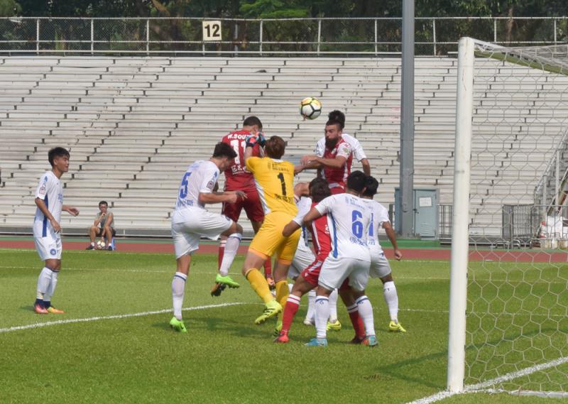 圖:蘇沙(左三)接應角球頂入,助南區先開紀錄大公報記者何嘉軒攝