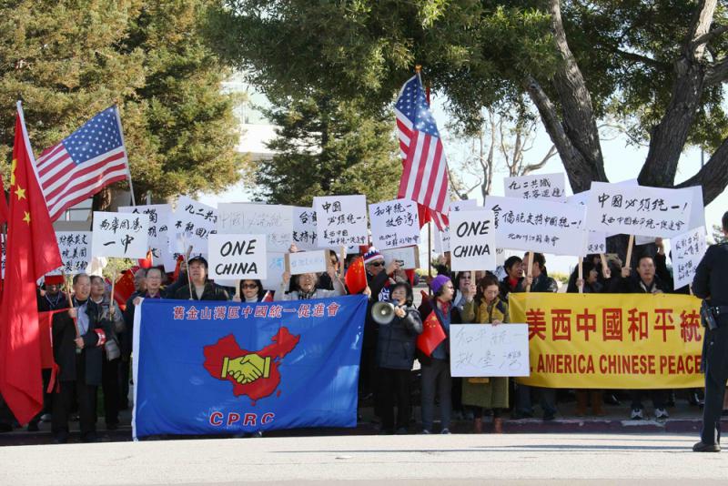 圖:14日上午在美國三藩市,台灣地區領導人蔡英文下榻的凱悅酒店前,多個華人華僑組織聯合組織了「反對台獨人人有責,中國統一亞太安全『嗆蔡英文』」示威活動 中新社