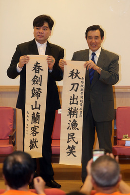 東吳大學中文系去年9月舉辦全球徵聯活動,邀請馬英九以「秋刀出鞘漁民笑」為上聯,公開向全球對聯愛好者徵求下聯。時隔9個多月後,徵聯活動舉行頒獎典禮,馬英九也受邀在現場揮毫第一名的作品。