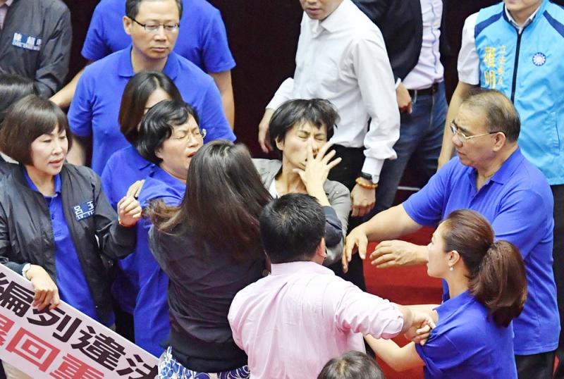 圖:國民黨十三日拒絕審查「前瞻計劃」預算,在立院佔領發言台,國民黨立委許淑華與民進黨立委邱議瑩爆發肢體衝突 中央社