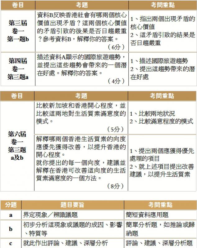 要應對「一題兩問」的題目,考生務必小心審題,辨識題目只有一個問題,還是內裏包含兩個問題,作答時不要遺漏。第二,「一題兩問」的題型其實有其不公平和不客觀之處。不同閱卷員定必會對兩個提問之間分數的分配,有不同理解,形成評分準則的差異。即使考評局為閱卷員統一了兩個提問之間分數的分配,考生根本無法從提問字眼得知兩個提問所佔分數的輕重。考生可能會將重點放在第一問,而第二問則簡單作答,但考評局可能將評分重點放在第二問,令考生無辜失分。因此,考生回應此類題目,要分析兩條題目的關係,分配作答的時間。如果兩個提問是並列式的,如新一屆卷一第三題分題а,考生可以平均作答。如果提問是有遞進的,如上述卷一第三題分題Ь,第一問屬界定範圍「解釋哪兩個香港生活質素的向度應優先獲得改善」,第二問屬深化分析或評論,如「建議並解釋在香港可改善這向度的生活質素滿意度的一個方法」,後者應分配更多作答時間。如臨場無法判斷,宜取中庸之道,對兩個提問平均作答。