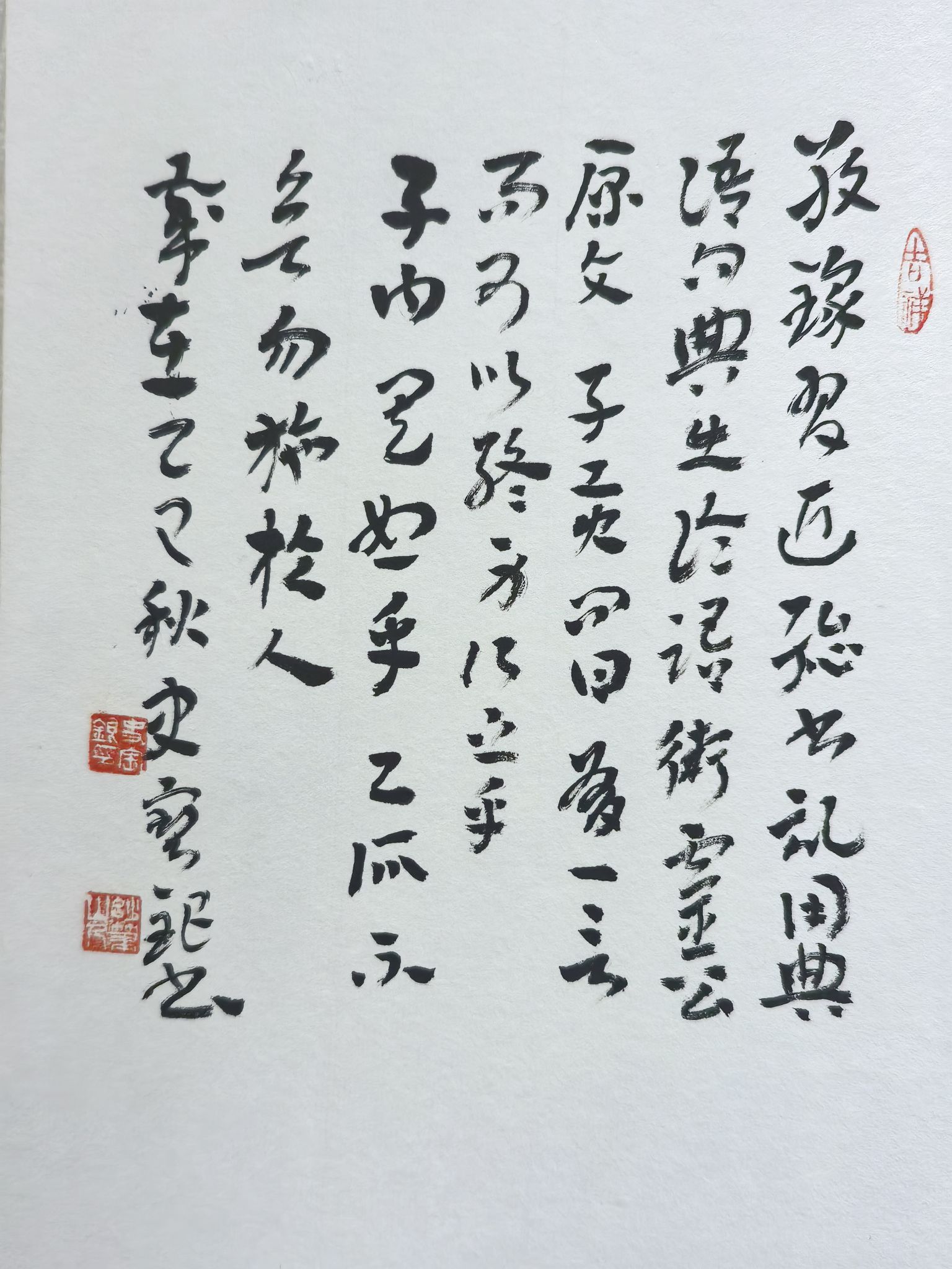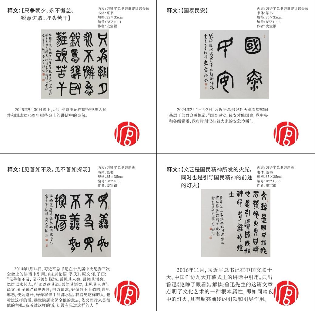 史寶銀書法小品展的另一個亮點,是作品內容選擇的精心與深邃。展覽作品中,既有重要講話金句摘錄,也有在各個場合中講話用典,展現出作者深厚的政治高度和文化修養。李強院長在觀賞《⽂藝是國⺠精神所發的⽕光,同時也是引導國⺠精神的前途的燈火》繫列作品時評價道:「寶銀的書法不僅是筆墨技巧的展示,更是文化情懷的抒發。他將對中原文化、黃河文明的理解融入創作,使得作品具有了超越形式的文化內涵。」