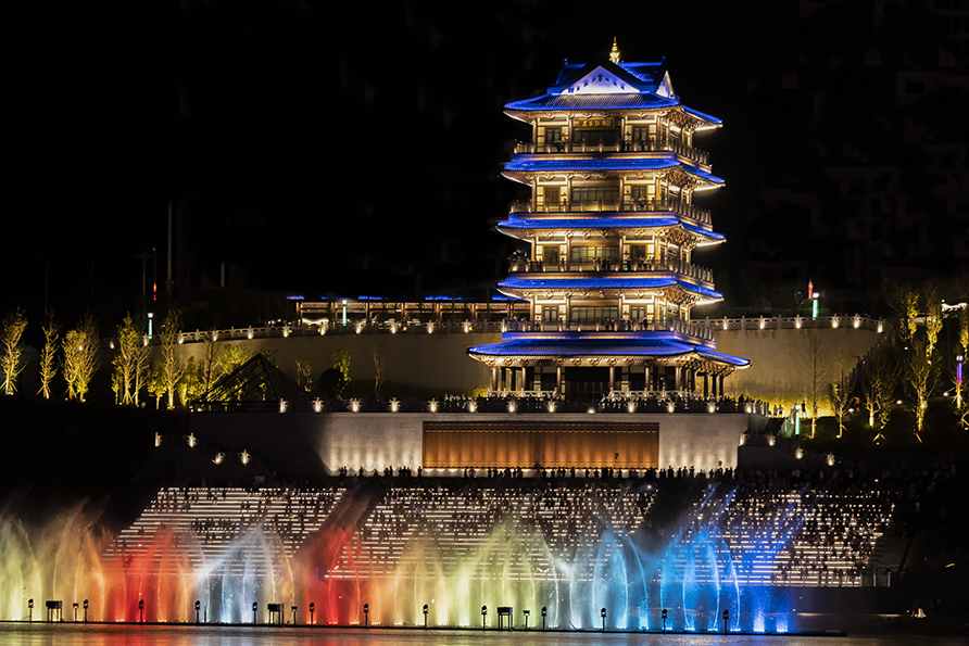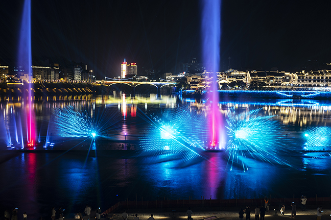 與此同時,沅、巫兩水沿岸的夜景燈光秀持續點亮古城夜空,科技與藝術交融的光影勾勒出屈子江閣的典雅輪廓,音樂噴泉隨旋律舞動,燈光水秀如飛瀑傾瀉,構成一幅流動的水鄉畫卷。遊客或聚集江邊碼頭,或駐足觀景平台,在璀璨燈火中感受古城與山水的和諧交融,夜間客流的持續攀升也帶動周邊酒店、民宿 「夜夜爆滿」。