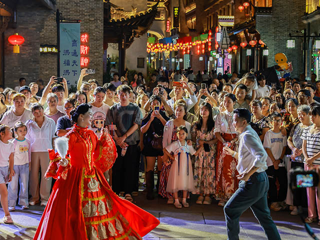 夜幕降臨,「又見小城故事」沉浸式演藝接續登場,歌舞與情景劇節目以快閃形式在洪江古商城「煙雨洪江」街區上演,遊客跟隨演員穿行街巷,欣賞戲曲、歌舞、員外招婿等沉浸式表演,充分感受洪江古商城旅遊區的夜間魅力。