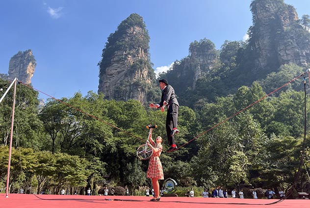 2025張家界國際新雜技戲劇周期間,來自13個國家和地區的優秀藝術家與團體以「仙峰技語」為名,將5天時間裏在張家界的奇峰秀水間帶來60餘場演出,融合戲劇、舞蹈、音樂、新媒體等多種元素,表演涵蓋高空、地面、平衡、柔術等多種雜技門類,並結合環境戲劇、沉浸式演出、戶外互動等多種形式,展現雜技藝術的「專業性」與「前瞻性」。