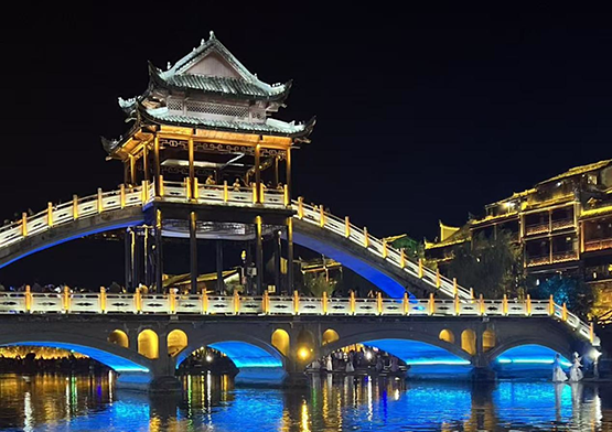 所謂有鳳來儀,有道則見。而天下有道,方能天下太平。在一派祥和流淌之中,入夜的鳳凰古城霓燈閃爍,流光溢彩。無論是古塔、古廟、古橋、古樓,重新煥發了活力,多彩多情,活力四射。沈從文故居、熊希齡故居等大量古宅匯百年滄桑,仍風韻猶存。