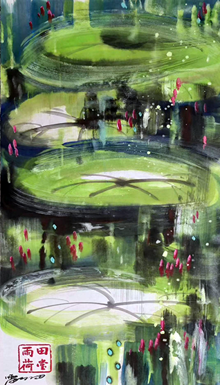 「蕭韶九成,鳳皇來儀」。西漢辭賦家司馬相如的「鳳兮鳳兮歸故鄉,遨遊四海求其凰」也成為求愛的千古名句。鳳凰古城人傑地靈,凝天地日月之精華,得山水人文之靈氣,匯百年滄桑,仍風韻猶存。雷雨田尤其喜歡象徵和和美美的荷花。為此,他在夏日裏常去賞荷、悟荷、畫荷。他用色大膽,大寫意之荷葉妍麗溫雅,深得國際友人喜愛。他在藝術的升華中提煉出來的「簡、韻、活、妙」等獨特技法,大寫意畫技法獨特,構思立意廣遠,用筆簡約凝練,線條豪放灑脫, 筆墨收放之間,盡顯大家風範。個人作品廣泛被國內外收藏家、友人及博物館收藏。