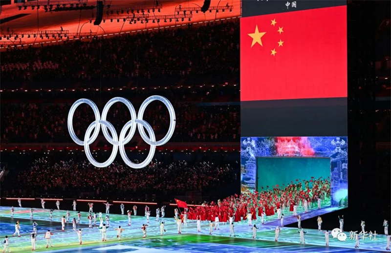 2022北京冬奧會開幕式的中華人民共和國國旗入場環節中,「七一勳章」獲得者、北京冬奧會火炬手買買提江·吾買爾,與國內各行各業的代表、國家功勛人員、56個民族的代表,用手手相傳的方式,傳遞國旗,向國旗行注目禮。